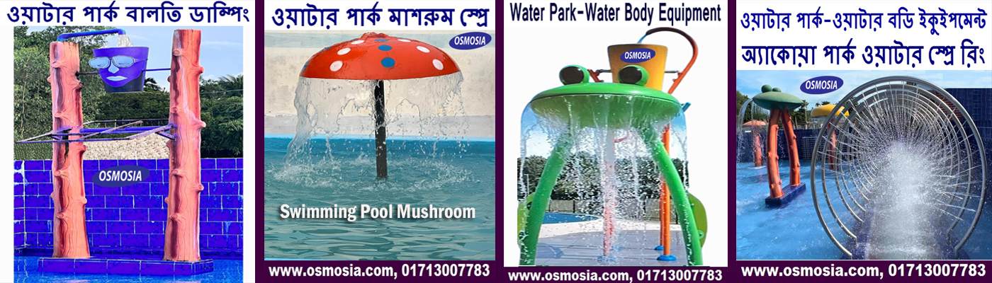 শিশুদের / পারিবারিক চিত্তবিনোদনের জন্য OSMOSIA সুইমিং পুল সরঞ্জাম ওয়াটার পার্ক Lazy নদী, ওয়াটার পার্কের জন্য মাশরুম এবং বিভিন্ন ধরনের ওয়াটার খেলনা, বাংলাদেশের পার্ক ও রিসোর্টে ফাইবারগ্লাস স্লাইডের চাহিদা দিন দিন বাড়ছে।, Mushrooms and various types of water toys for water parks, Water Play Spray Tunnel and Water Park Equipment. Recently, it has been observed that splash pads at various water parks have the highest number of children present.